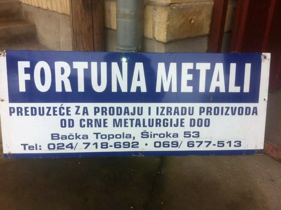 Fortuna metali doo sa sedištem u Bačkoj Topoli posluje od 2008 godine. Preduzeće se bavi prodajom i izradom proizvoda od crne metalurgije,imamo veleprodaju i maloprodaju. Pored ovoga radimo i armature, univerzalno pletivo za ograde bašte, mreže za betoniranje, cevi profilne, šavne i hidroispitane, aluminijumske lajsne, žice za varenje, elektrode, zaštitne rukavice, razređivače i farbe i svu šrafovsku robu . Trenutno imamo 2 zaposlena radnika. Naše radno vreme je 8-16h radnim danima, subotom 8-13h.