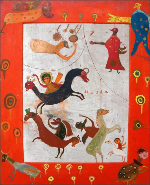 Sam umetnik to objašnjava rečima da se on lično u toku svog života uverio da su sva božija stvorenja na ovom svetu maramice sa dva lice, da jedno lice prikazuju pred svetom, a drugo, pravo kriju i samo retki imaju priliku da ga vide. Na Ilijinim slikama posmatrač nije siguran da li gleda u predstavu anđela ili savremenog kosmonauta, cara Lazara ili kralja Ilijine Ilijade, domaće, divlje ili apokaliptične životinje. U tumačenju njegovih slika često nam pomažu nazivi koje je on sam davao svojim slikama.